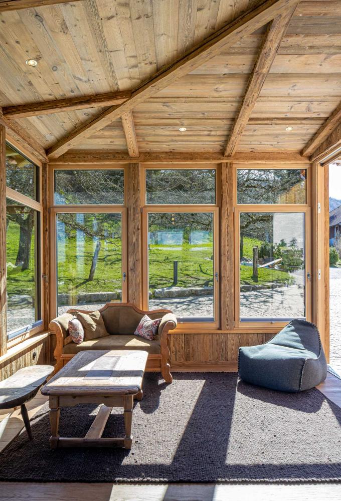 „Unsere Philosophie ist: Wer billig kauft, kauft teuer“, unterstreicht Manuela. „Ich halte nichts von der Wegwerfgesellschaft. Wir haben gesagt, wenn wir bauen, dann richtig.“ Und das sieht man. Betritt man den ehemaligen Schweinestall hofseitig, steht man inmitten einer spektakulär-schönen Bibliothek. Über zwei Ebenen erstreckt sich der Raum, der auch von Schülern und Lehrern der Privatschule genutzt werden kann. Auch in der Bibliothek dominiert geschichtsträchtiges Altholz – eine in doppelter Hinsicht schöne Kombination. Als Lese- und Aufenthaltsbereich lockt der von HOLZFORM umgesetzte Wintergarten, der direkt an die Bibliothek anschließt. Die großen Fenster verbinden sich mit dem alten Holz und der gemütlichen Einrichtung zu einem charmanten Ganzen – ein Raum, in dem man sich einfach gerne aufhält.