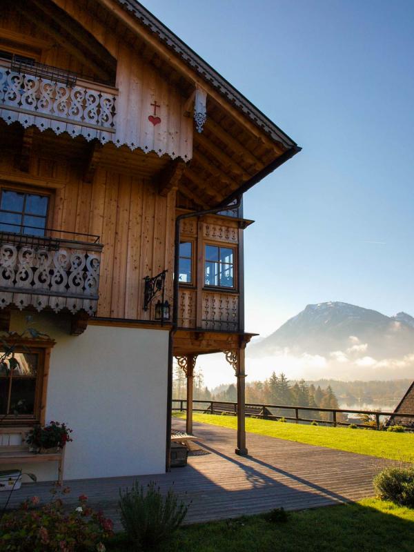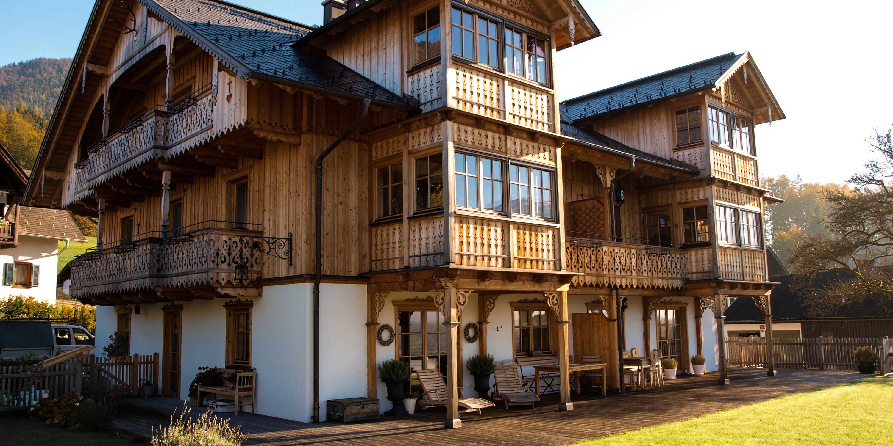 Mit ihrem „Haus am See“ haben sich Sigrid und Hans Gründbichler vor einigen Jahren einen Lebenstraum erfüllt. Heute kommen Menschen aus aller Welt hierher, um das Haus im traditionellen Stil des Salzkammergutes aus der Nähe zu sehen. Wahrscheinlich ist es eines der meistfotografierten Häuser der Region. Mit Sicherheit ist es eines der detailreichsten Häuser im traditionellen Baustil des Salzkammergutes. Fast 30 Jahre lang hat Hans nach dem perfekten Grundstück in Ried am Wolfgangsee gesucht, bis er es schließlich gefunden hat. Über fünf Jahre haben Sigrid und Hans Details aus allen Ecken des Salzkammerguts zusammengetragen – von kleinsten Ausschnitten bis zu originalen geschmiedeten Außenlampen mit Butzenscheiben aus der Jahrhundertwende. „Matthias hat von uns zwei CDs voll mit verschiedenen Details bekommen“, sagt Sigrid und lacht. „Da war a bisserl was zu tun“.