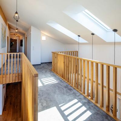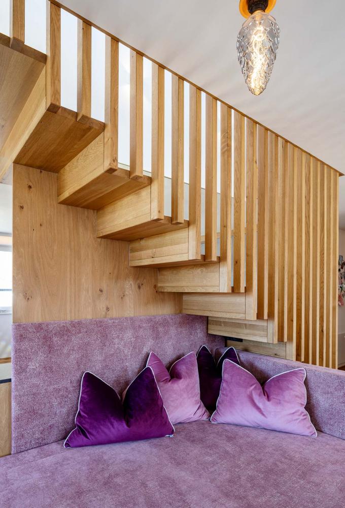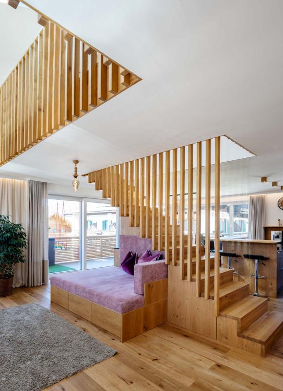 Dann konnte es aber losgehen. „Ein für uns sehr wichtiger Punkt war, dass Geschäft und Werkstatt während der Bauphase ungestört weiterlaufen konnten“, so Vitus Eder. „Das hat sehr gut funktioniert.“ Der Dachboden wurde zur Gänze abgebrochen und eine neue Massivholzdecke eingezogen. Anschließend wurde das Gebäude um ein Geschoß erhöht. „Diese Wohnung nutzt jetzt unser Sohn Vitus mit seiner Familie“, erklärt Vitus Senior. „Mir persönlich gefällt der Holztram besonders gut, der sich durchs Gebäude zieht. Auch die Eichenstiege im Wohnbereich, die als Raumteiler und Galerie dient, ist ein echter Hingucker.“ Seeseitig wurden außerdem großzügige Terrassen angebaut – mit herrlichem Blick in Richtung Fuschlsee.