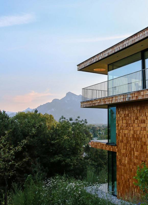 Aufgrund der besonderen Lage des Grundstücks wurde das Haus dem Grund angepasst und nach vorne hin schmäler gebaut. Viel Licht zeichnet die Wohnräume aus, große Terrassen und eine Dachterrasse runden das Konzept ab. Im Inneren des modernen Baumhauses dominieren Holz, Glas und Sichtbeton. Geheizt werden die drei Geschoße, die auf rund 185 m² Wohnfläche verteilt sind, mit einer Erdwärmepumpe. Auch außen wurde der Naturaspekt konsequent umgesetzt – mit Holzschindeln. „Meine Architektin hat zu mir gesagt: Holzschindeln sind wie ein Kleid für ein Gebäude“, erinnert sich Toni und lächelt. „Diese Vorstellung hat mir sehr gut gefallen. Und bei einem Holzbau sind Schindeln einfach sehr schön. Mir war aber wichtig, dass die Schindeln genau zur Hausgröße passen. Auch da hat mich Matthias perfekt beraten.“